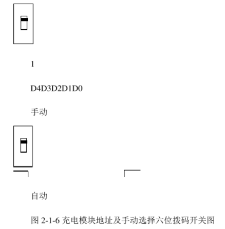 模塊面板上嵌入的電位器用來調整模塊在手動狀態下的輸出電壓,注意只有在手動方式下,調節該電位器才起作用。充電模塊地址及手動/自動撥碼開關用來設置模塊通訊地址和選擇手動功能,其定義如圖2-1-6所示: